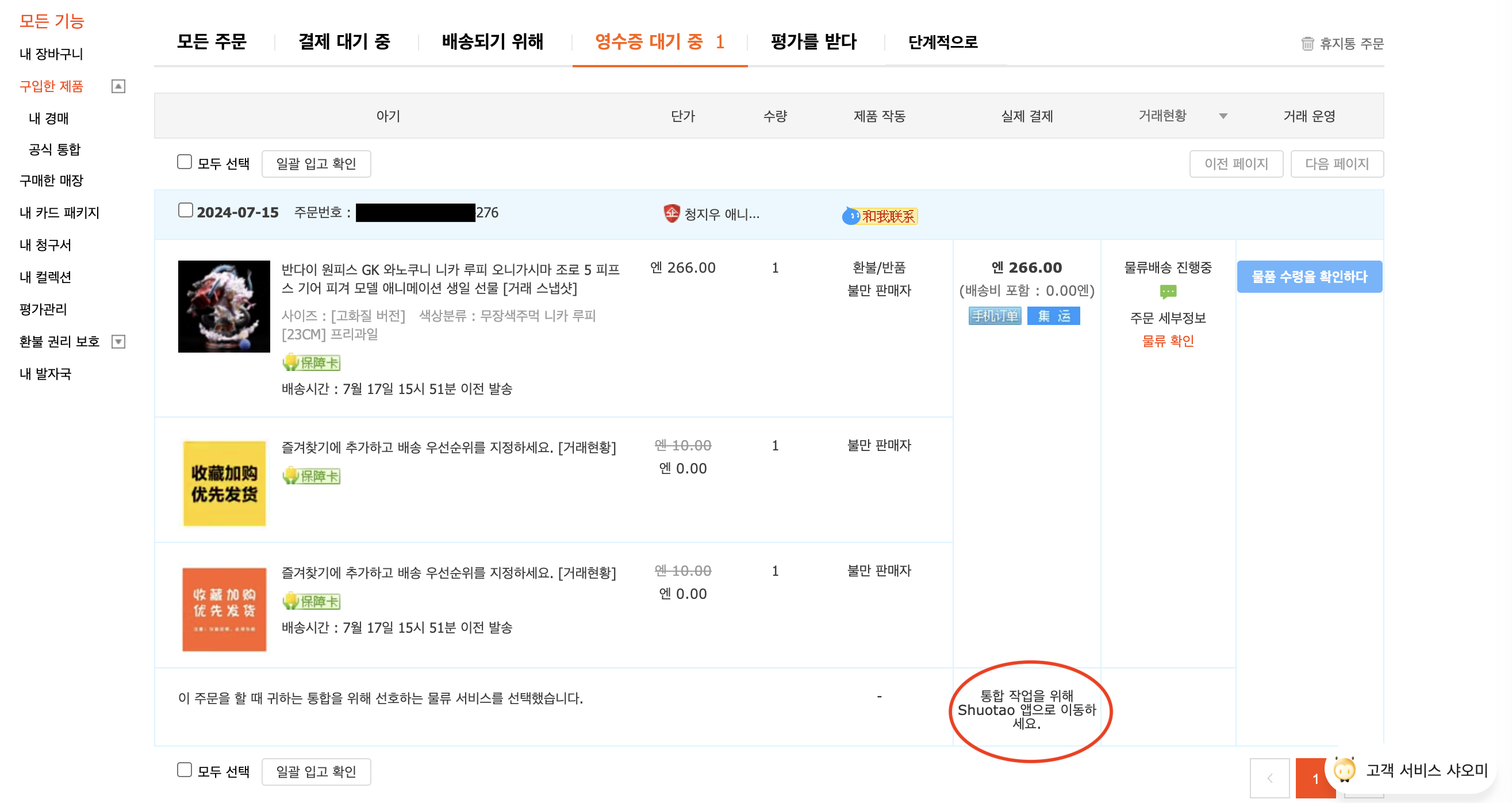 "통합 작업을 위해 Shuotao 앱으로 이동하세요."라고 뜨면 제3자배송(삼방물류) 합배송으로 된 거니 타오바오 앱으로 들어가서 배송비 결제 하면 됨.