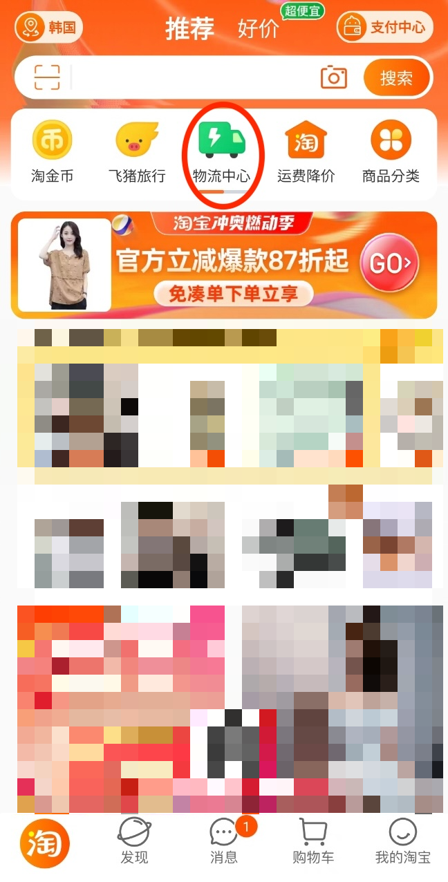 일단 타오바오 앱에 들어가보면 바로 상단에 있는 초록색 트럭 아이콘을 눌러준다.
